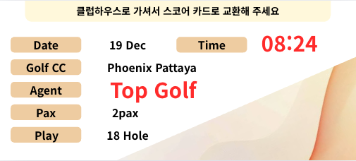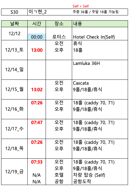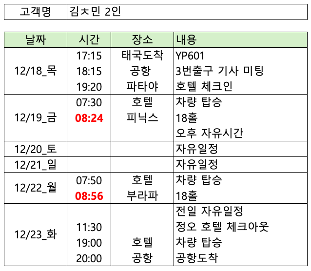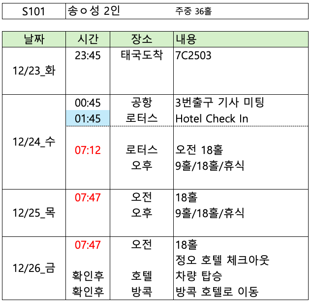 체크인 날짜 순으로 보시면 됩니다. 일정별 간략한 티오프 시간, 바우처 확인 #(12/12) 이 ㄱ현_2명 (S30) #(12/23) 송ㅇ성_2명 (S101) (12/18) 김ㅊ민_2인